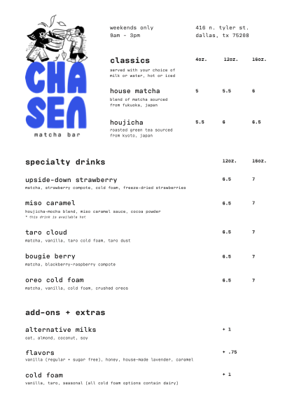Welcome to Chasen Matcha Bar, a delightful gem nestled at 416 N Tyler St, Dallas, TX 75208, where the enchanting world of matcha comes alive. Whether you're a matcha aficionado or a curious newcomer, this cafe promises a vibrant experience that blends quality ingredients, artistic drinks, and a charming atmosphere.